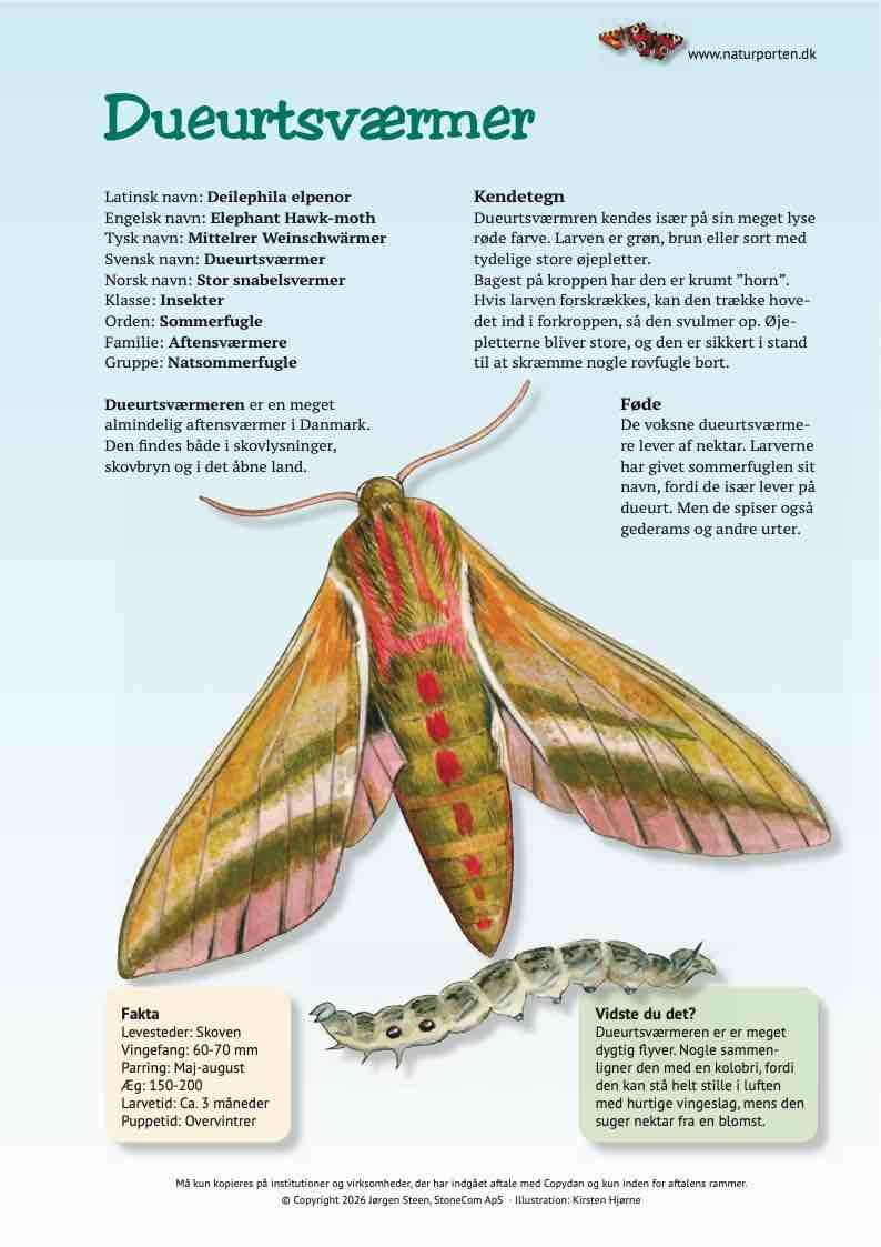 Dueurtsværmeren er en af de mest almindelige aftensværmere i Danmark. Den findes både i skovlysninger, skovbryn og i det åbne land.