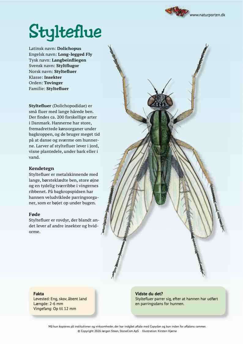 Styltefluer (Dolichopodidae) er små fluer med lange hårede ben. Der findes ca. 200 forskellige arter i Danmark. Hannerne har store, fremadrettede kønsorganer under bagkroppen, og de bruger meget tid på at danse og sværme om hunnerne. Larver af styltefluer lever i jord, visne plantedele, under bark eller i vand.