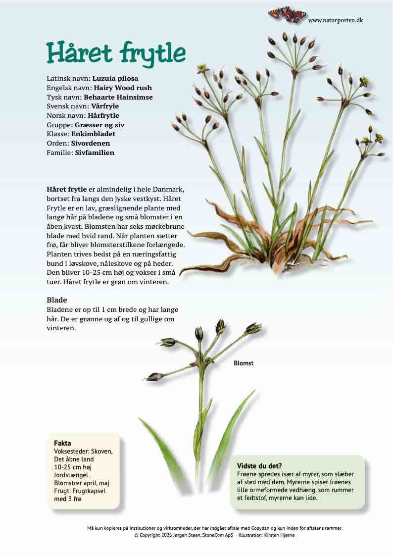 Håret frytle er almindelig i hele Danmark, bortset fra langs den jyske vestkyst. Håret Frytle er en lav, græslignende plante med lange hår på bladene og små blomster i en åben kvast. Blomsten har seks mørkebrune blade med hvid rand. Når planten sætter frø, får bliver blomsterstilkene forlængede. Planten trives bedst på en næringsfattig bund i løvskove, nåleskove og på heder. Den bliver 10-25 cm høj og vokser i små tuer. Håret frytle er grøn om vinteren.