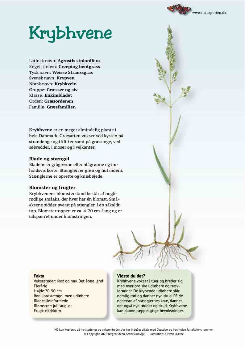 Krybhvene er en meget almindelig plante i hele Danmark. Græsarten vokser ved kysten på strandenge og i klitter samt på græsenge, ved søbredder, i moser og i vejkanter.