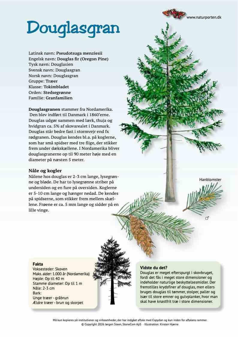 Douglasgranen stammer fra Nordamerika. Den blev indført til Danmark i 1860’erne. Douglas udgør sammen med lærk, thuja og hvidgran ca. 5% af skovarealet i Danmark. Douglas står bedre fast i stormvejr end fx rødgranen. Douglas kendes bl.a. på koglerne, som har små spidser med tre flige, der stikker frem under dækskællene. I Nordamerika bliver douglasgranerne op til 90 meter høje med en diameter på næsten 5 meter.