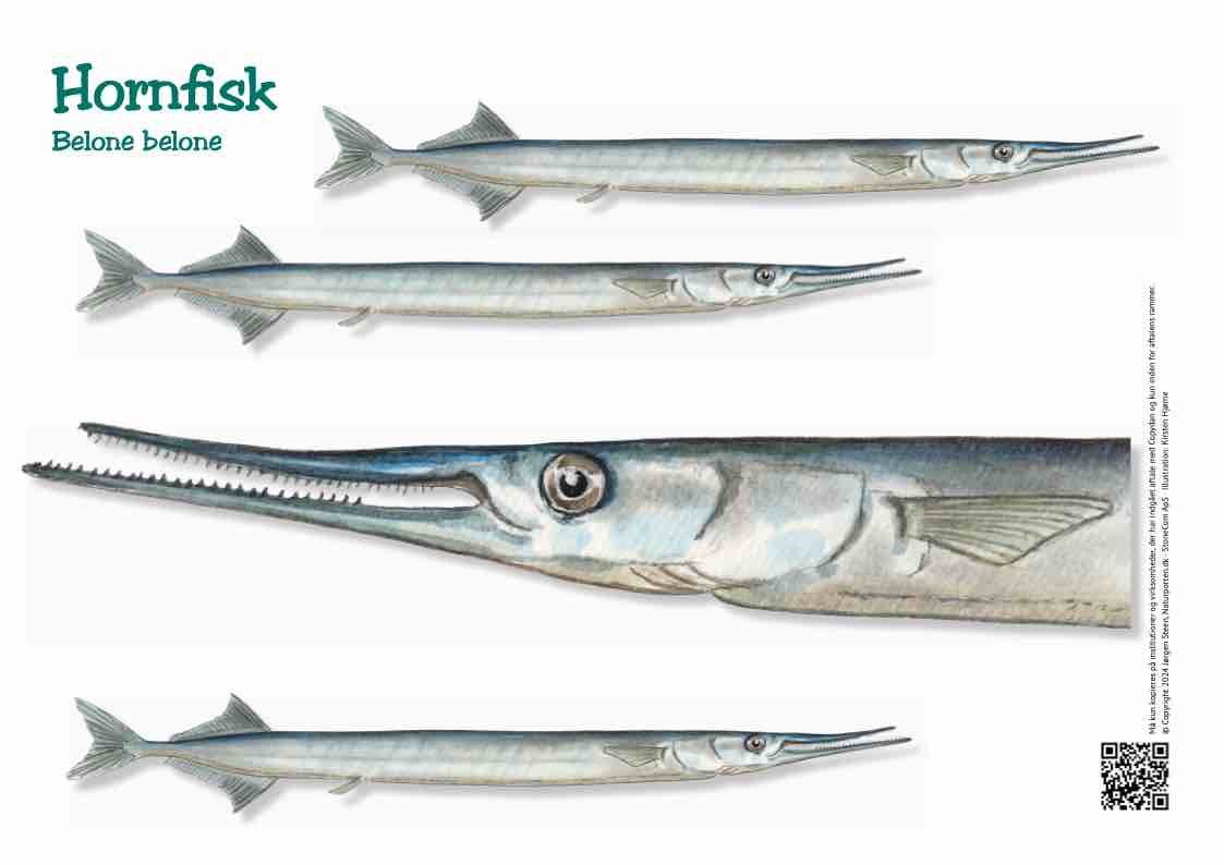 Hornfisken har en langstrakt, tynd krop. Ryg- og gatfinnen sidder meget langt tilbage på kroppen. Fiskens ryg er mørk blålig eller grønlig, hvorimod siderne er sølvfarvede. Hornfisken har lange kæber, der er besat af små, spidse tænder. Hornfiskens ben er grønlige på grund af et stort indhold af jernsulfat.