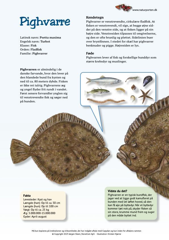 Pighvarren lever af fisk og forskellige bunddyr som større krebsdyr og muslinger.