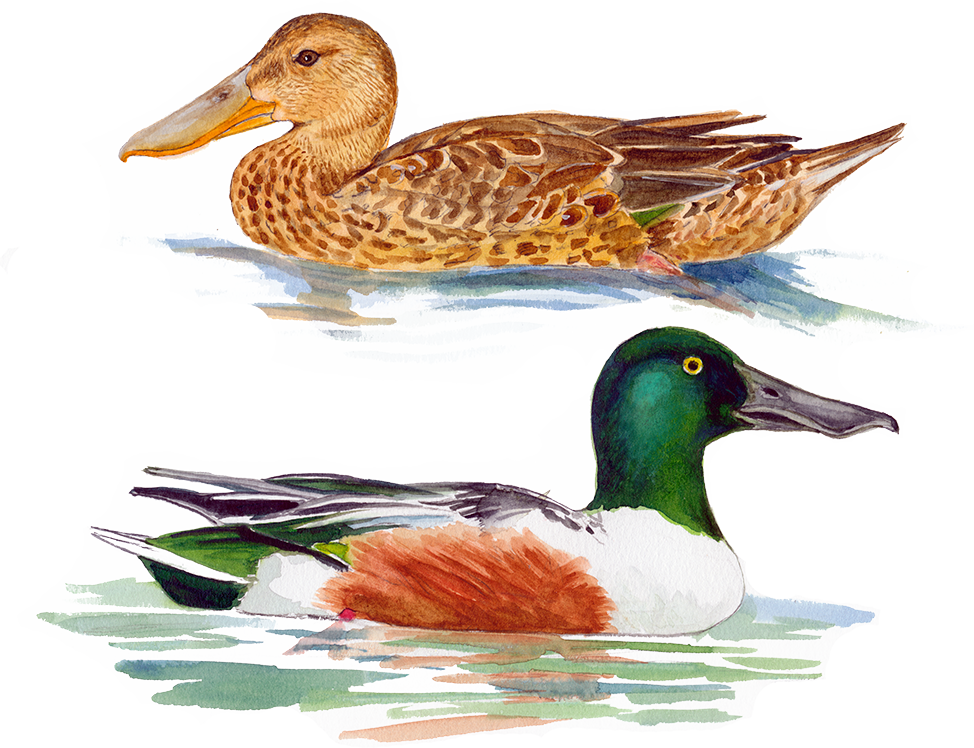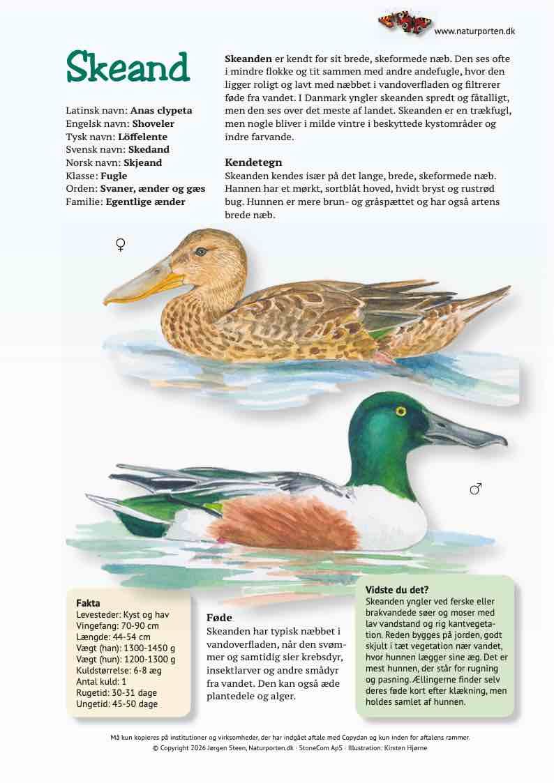 Skeanden kendes især på det lange, brede, skeformede næb. Hannen har et mørkt, sortblåt hoved, hvidt bryst og rustrød bug. Hunnen er mere brun- og gråspættet og har også artens brede næb.