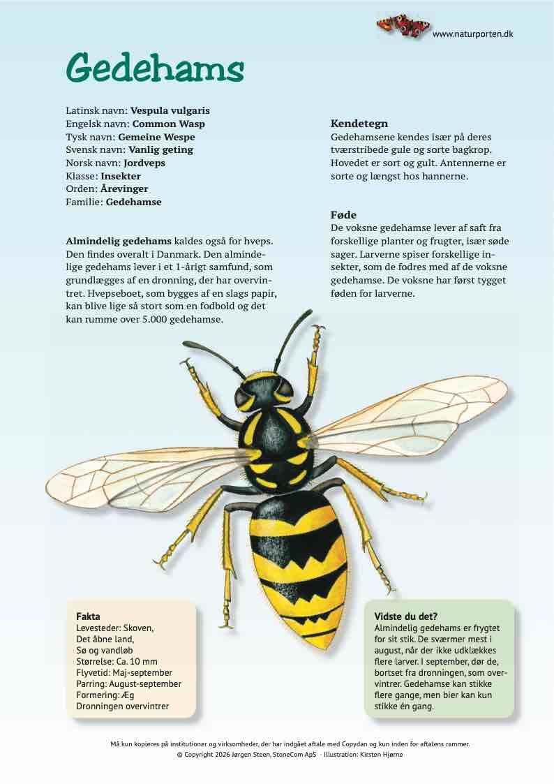 Almindelig gedehams kaldes også for hveps. Den findes overalt i Danmark. Den almindelige gedehams lever i et 1-årigt samfund, som grundlægges af en dronning, der har overvintret. Hvepseboet, som bygges af en slags papir, kan blive lige så stort som en fodbold og det kan rumme over 5.000 gedehamse.