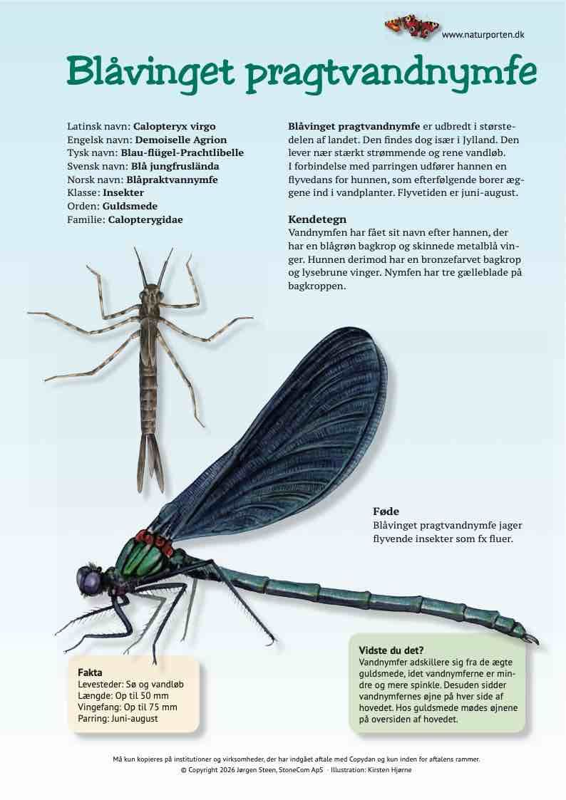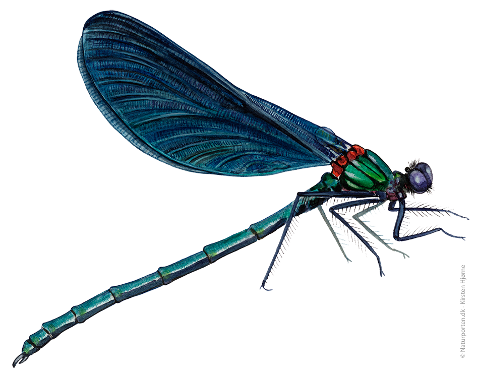 Blåvinget pragtvandnymfe jager flyvende insekter som fx fluer.