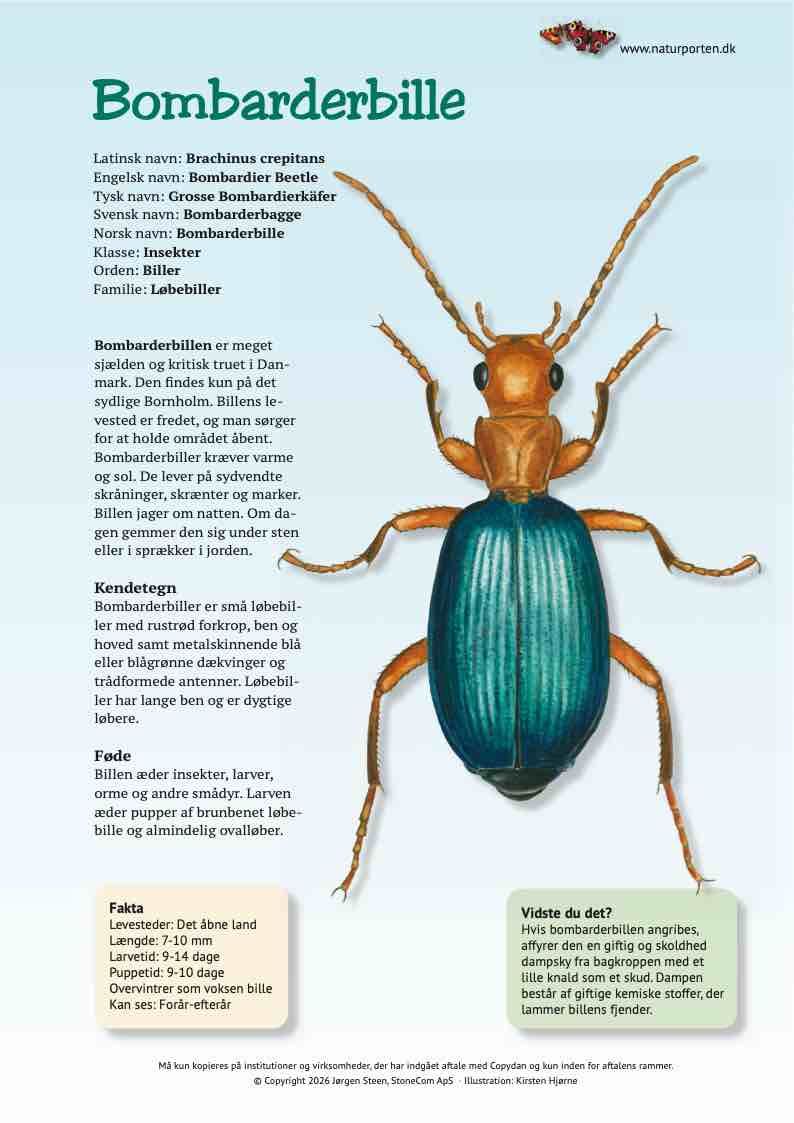 Bombarderbiller er små løbebiller med rustrød forkrop, ben og hoved samt metalskinnende blå eller blågrønne dækvinger og trådformede antenner. Løbebiller har lange ben og er dygtige løbere.