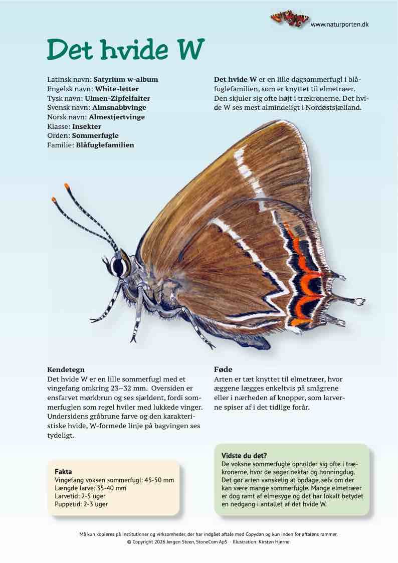 Det hvide W er en lille dagsommerfugl i blåfuglefamilien, som er knyttet til elmetræer. Den skjuler sig ofte højt i trækronerne. Det hvide W ses mest almindeligt i Nordøstsjælland.