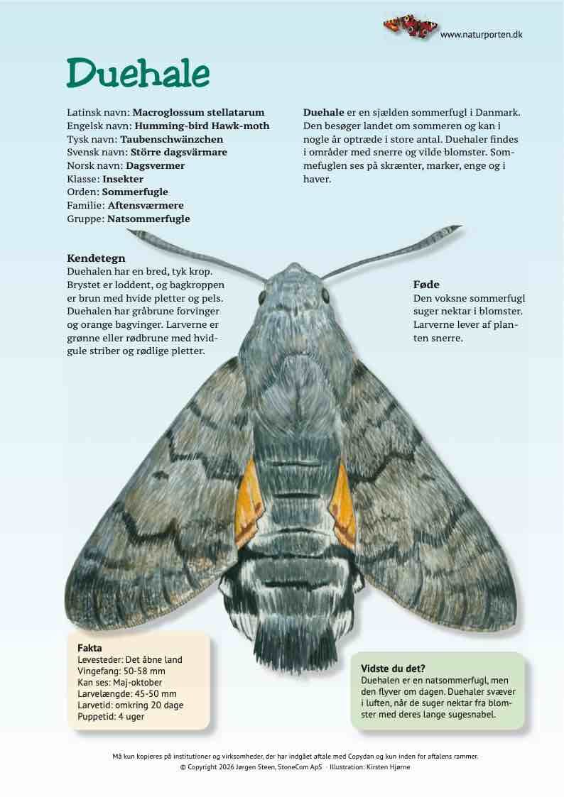 Duehalen er en natsommerfugl, men den flyver også om dagen. Duehaler svæver i luften, når de suger nektar fra blomster med deres lange sugesnab