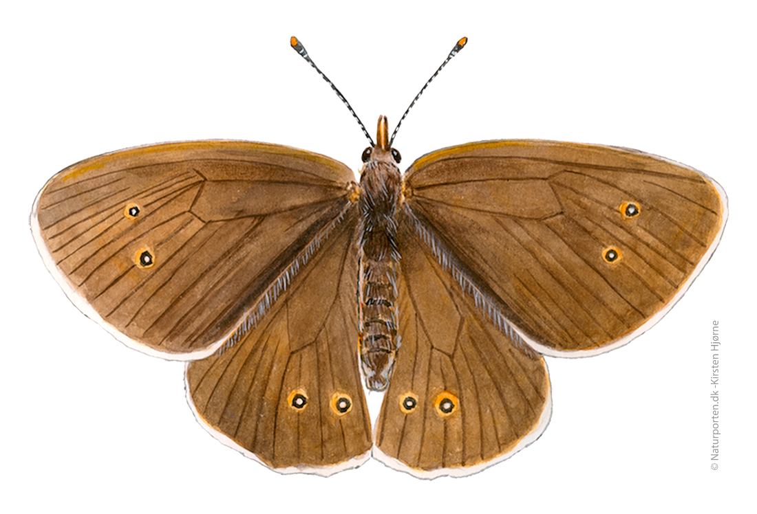 Oversiden af vingerne er mørkebrun med spredte, små øjepletter, dvs. en lys ring med et sort "øje" i. Langs vingeranden løber et hvidt bånd. Variationen både i farve og vingetegning er dog meget stor.