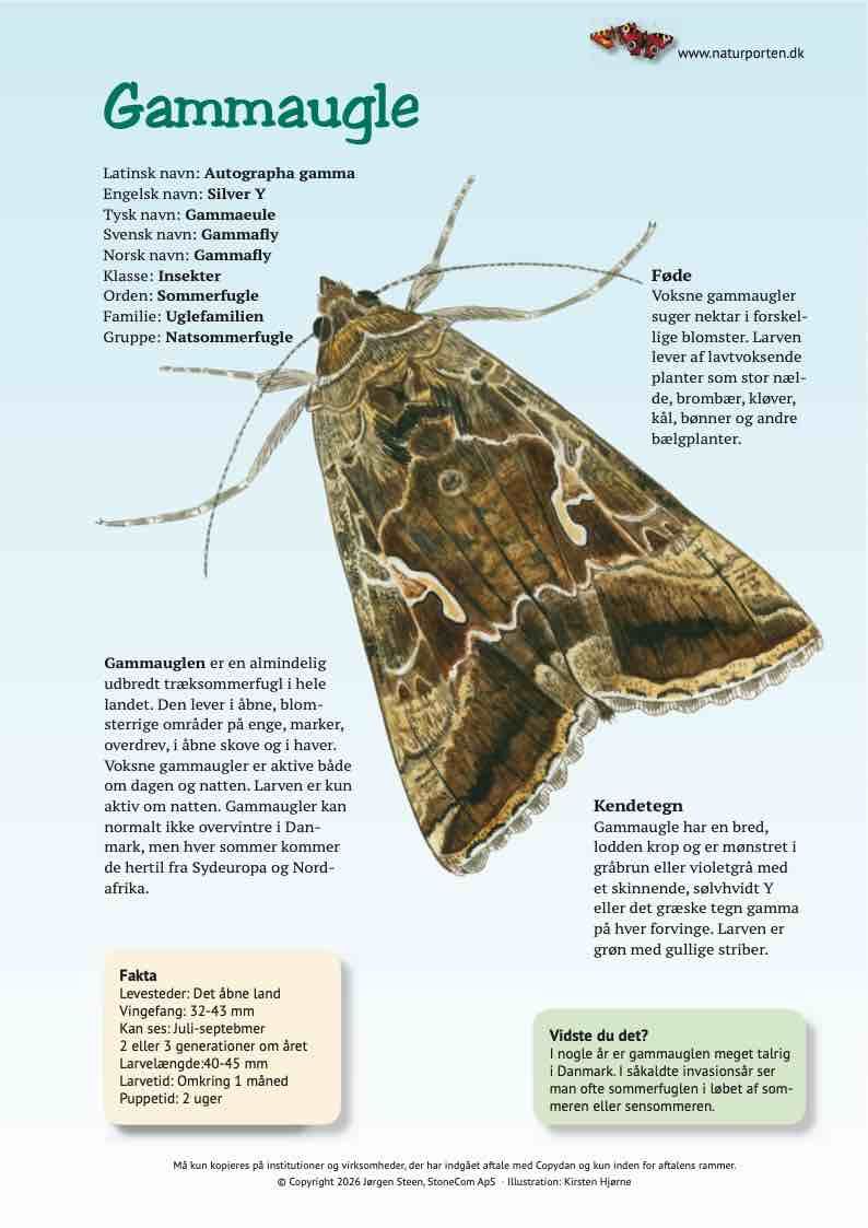 I nogle år er gammauglen meget talrig i Danmark. I såkaldte invasionsår ser man ofte sommerfuglen i løbet af sommeren eller sensommeren.