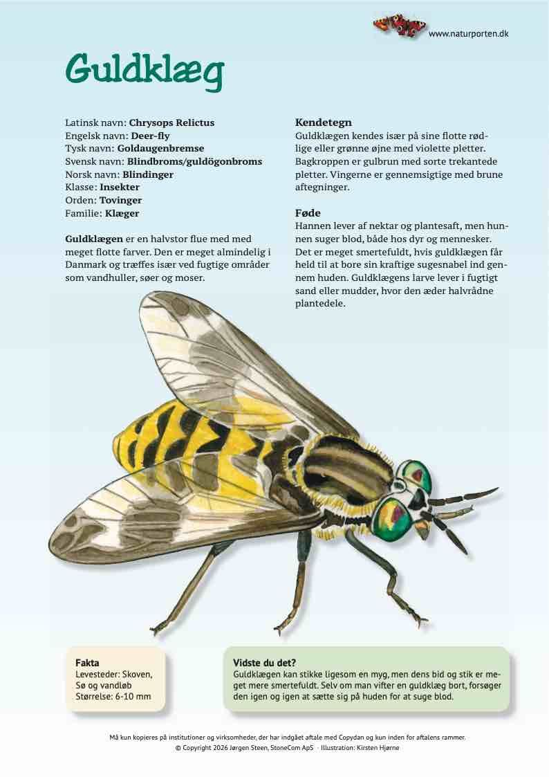 Guldklægen er en halvstor flue med med meget flotte farver. Den er meget almindelig i Danmark og træffes især ved fugtige områder som vandhuller, søer og moser.