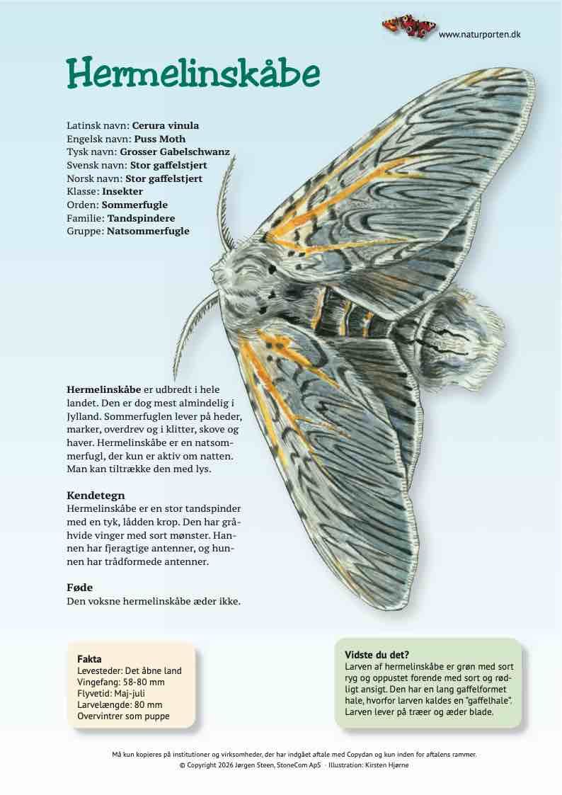 Larven af hermelinskåbe er grøn med sort ryg og oppustet forende med sort og rødligt ansigt. Den har en lang gaffelformet hale, hvorfor larven kaldes en "gaffelhale". Larven lever på træer og æder blade.