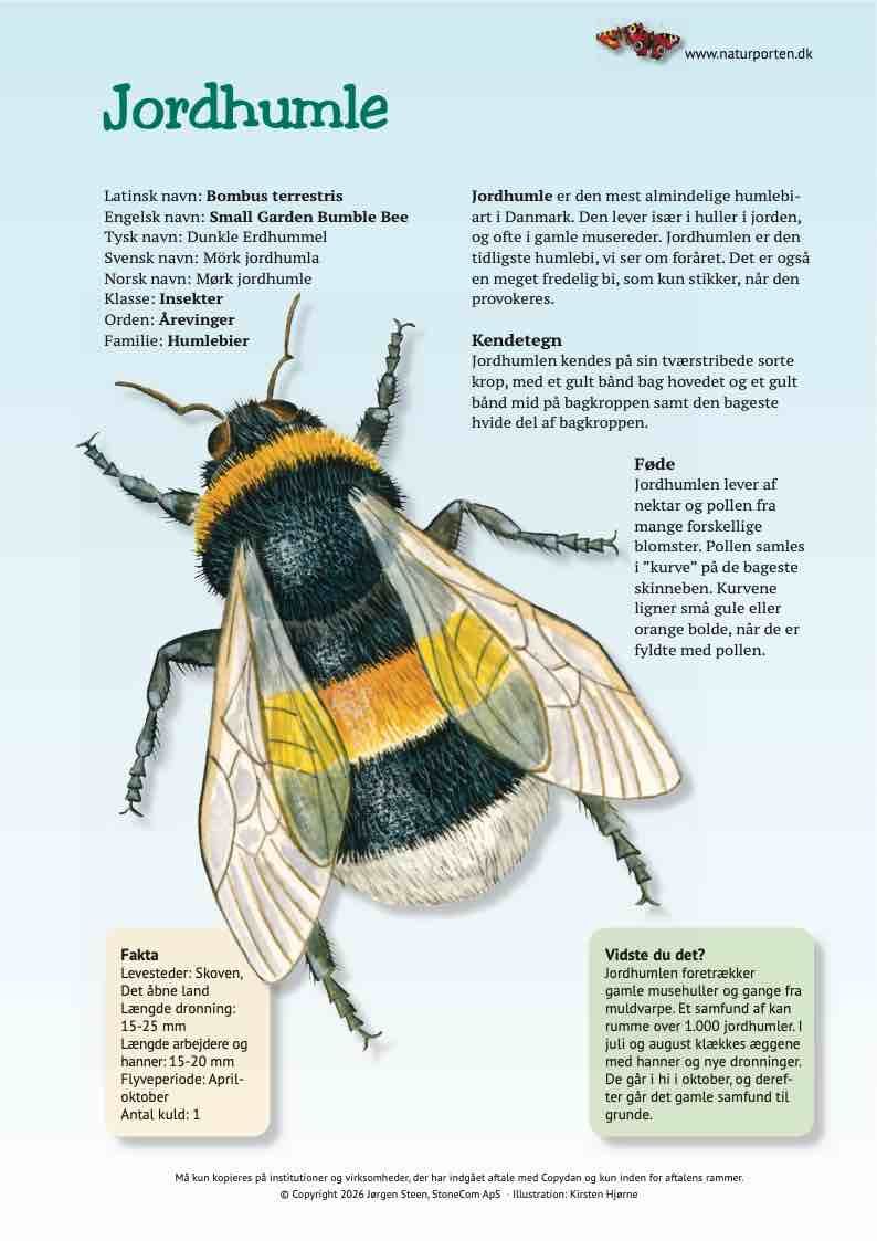 Mørk jordhumle er den mest almindelige humlebi-art i Danmark. Den lever især i huller i jorden, og ofte i gamle musereder. Jordhumlen er den tidligste humlebi, vi ser om foråret. Det er også en meget fredelig bi, som kun stikker, når den provokeres.