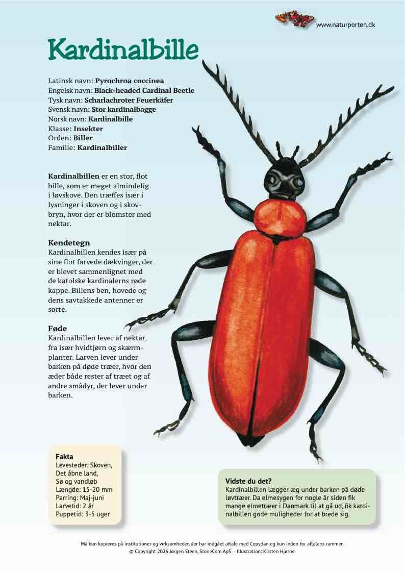Kardinalbillen kendes især på sine flot farvede dækvinger, der er blevet sammenlignet med de katolske kardinalerns røde kappe. Billens ben, hovede og dens savtakkede antenner er sorte.