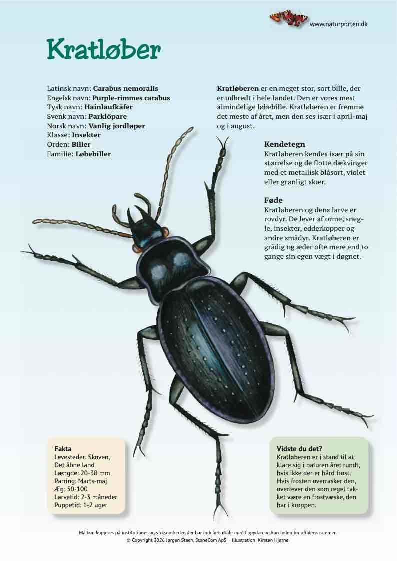 Kratløberen er en meget stor sort bille, der er udbredt i hele landet. Den er vores mest almindelige løbebille. Kratløberen er fremme det meste af året, men den ses især i april-maj og i august.