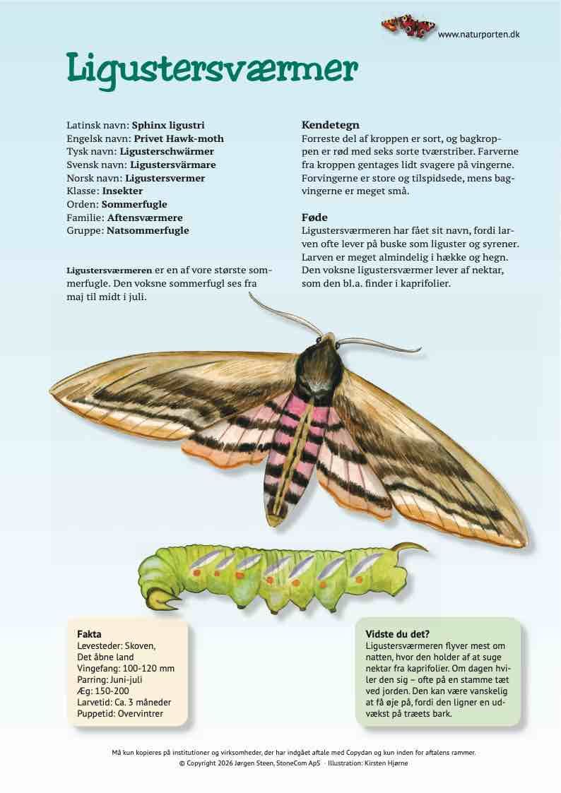 Ligustersværmeren er en af vore største sommerfugle. Den voksne sommerfugl ses fra maj til midt i juli.