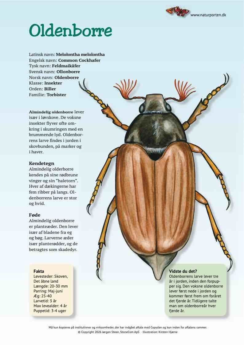 Almindelig oldenborre kendes på sine rødbrune vinger og sin haletorn. Hver af dækvingerne har fem ribber på langs. Oldenborrens larve er stor og hvid.