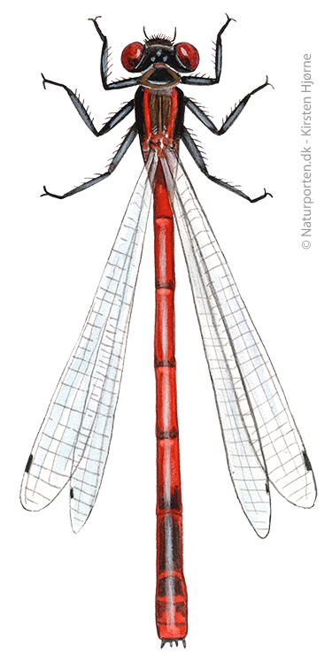 Hannen har rød bagkrop med tydelige sorte aftegninger på de forreste og bagerste led. Forkroppen er rød og sort, mens øjnene er røde. Hunnen ligner hannen meget, men har dog en smal sorte stribe på bagkroppen samt en læggebrod bagest på bagkroppen.