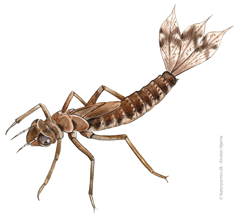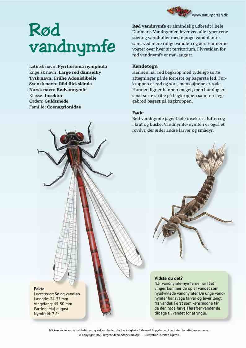 Når vandnymfe-nymferne kan flyve, kommer de op af vandet som nyudviklede vandnymfer. De unge vandnymfer har svage farver og lever langt fra vandet. Først som kønsmodne får de den røde farve. Herefter vender de tilbage til vandet for at yngle.