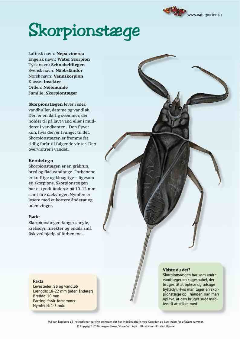 Skorpionstægen fanger snegle, krebsdyr, insekter og endda små fisk ved hjælp af forbenene.