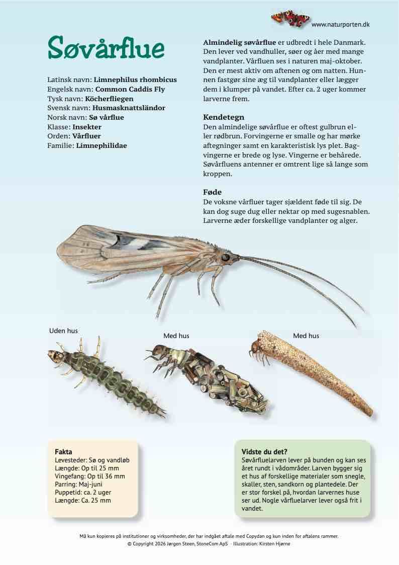 Søvårfluelarven lever på bunden og kan ses året rundt i vådområder. Larven bygger sig et hus af forskellige materialer som snegle, skaller, sten, sandkorn og plantedele. Der er stor forskel på, hvordan larvernes huse ser ud. Nogle vårfluelarver lever også frit i vandet.