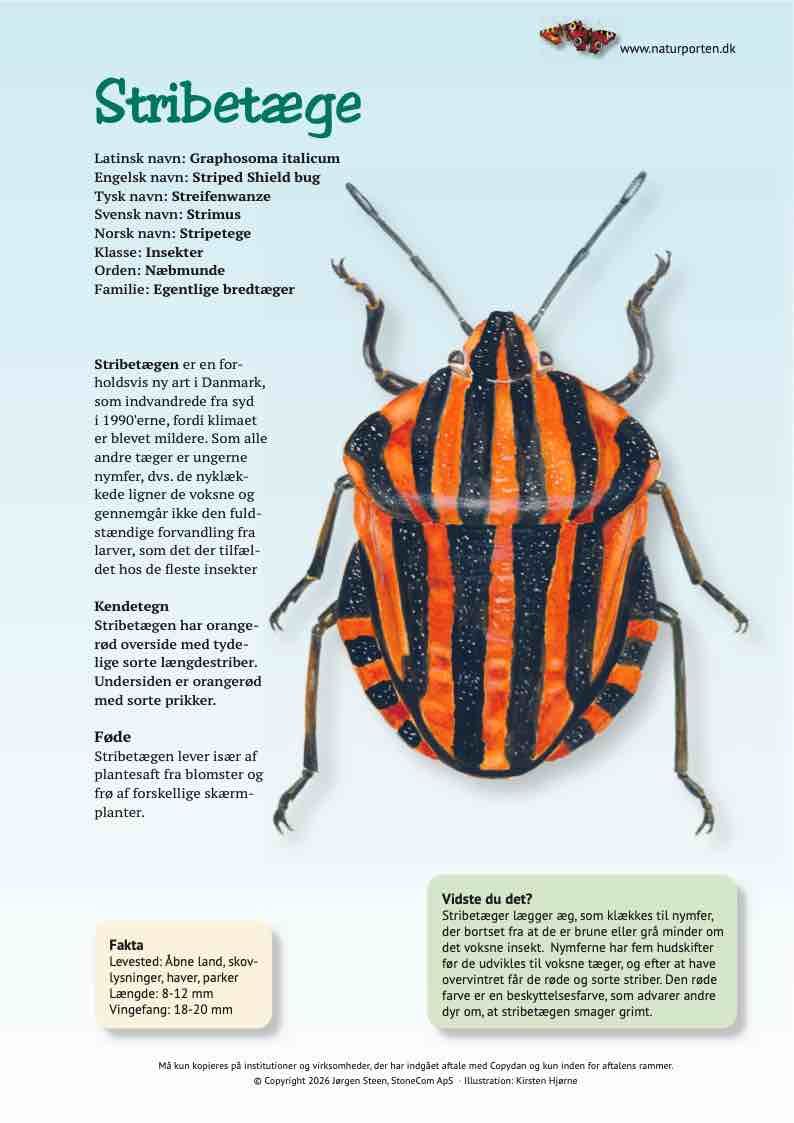 Stribetægen er en forholdsvis ny art i Danmark, som indvandrede fra syd i 1990'erne, fordi klimaet er blevet mildere. Som alle andre tæger er ungerne nymfer, dvs. de nyklækkede ligner de voksne og gennemgår ikke den fuldstændige forvandling fra larver, som det der tilfældet hos de fleste insekter