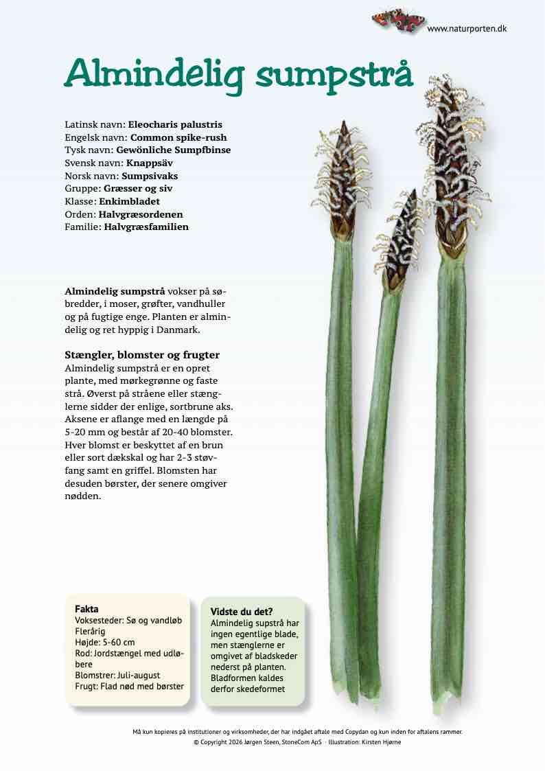 Almindelig sumpstrå er en opret plante, med mørkegrønne og faste strå. Øverst på stråene eller stænglerne sidder der enlige, sortbrune aks. Aksene er aflange med en længde på 5-20 mm og består af 20-40 blomster. Hver blomst er beskyttet af en brun eller sort dækskal og har 2-3 støvfang samt en griffel. Blomsten har desuden børster, der senere omgiver nødden.