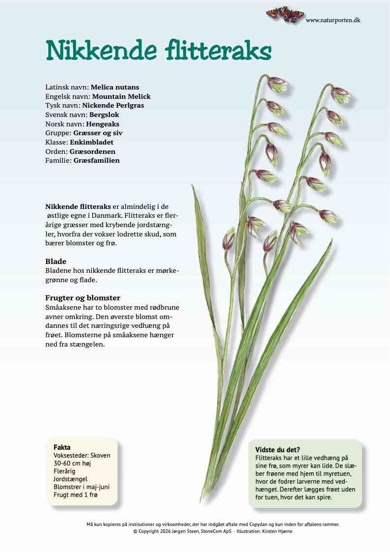 Nikkende flitteraks er almindelig i de østlige egne i Danmark. Flitteraks er flerårige græsser med krybende jordstængler, hvorfra der vokser lodrette skud, som bærer blomster og frø.