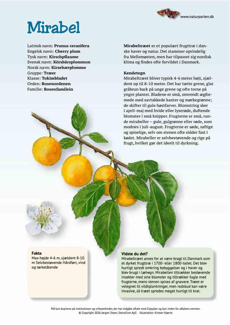 Mirabeltræet er et populært frugttræ i danske haver og natur. Det stammer oprindelig fra Mellemøsten, men har tilpasset sig nordisk klima og findes ofte forvildet i Danmark.