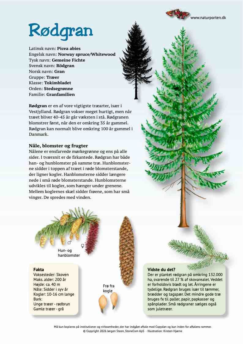 Rødgran er en af vore vigtigste træarter, især i Vestjylland. Rødgran vokser meget hurtigt, men når træet bliver 40-45 år går væksten i stå. Rødgranen blomstrer først, når den er omkring 35 år gammel. Rødgran kan normalt blive omkring 100 år gammel i Danmark.