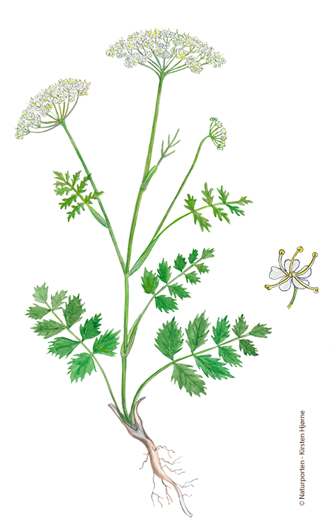 Stænglen er glat eller dunhåret med striber. I frugtstadiet kan stænglen være svagt hul, men den har også en marv. Grundbladene er fjersnitdelte og fint takkede. De øverste stængelblade har ofte rødlig bladskede. Blomsterne er hvide og sidder i dobbeltskærme. Frugten er ægformet og stribet. Roden er kraftig.